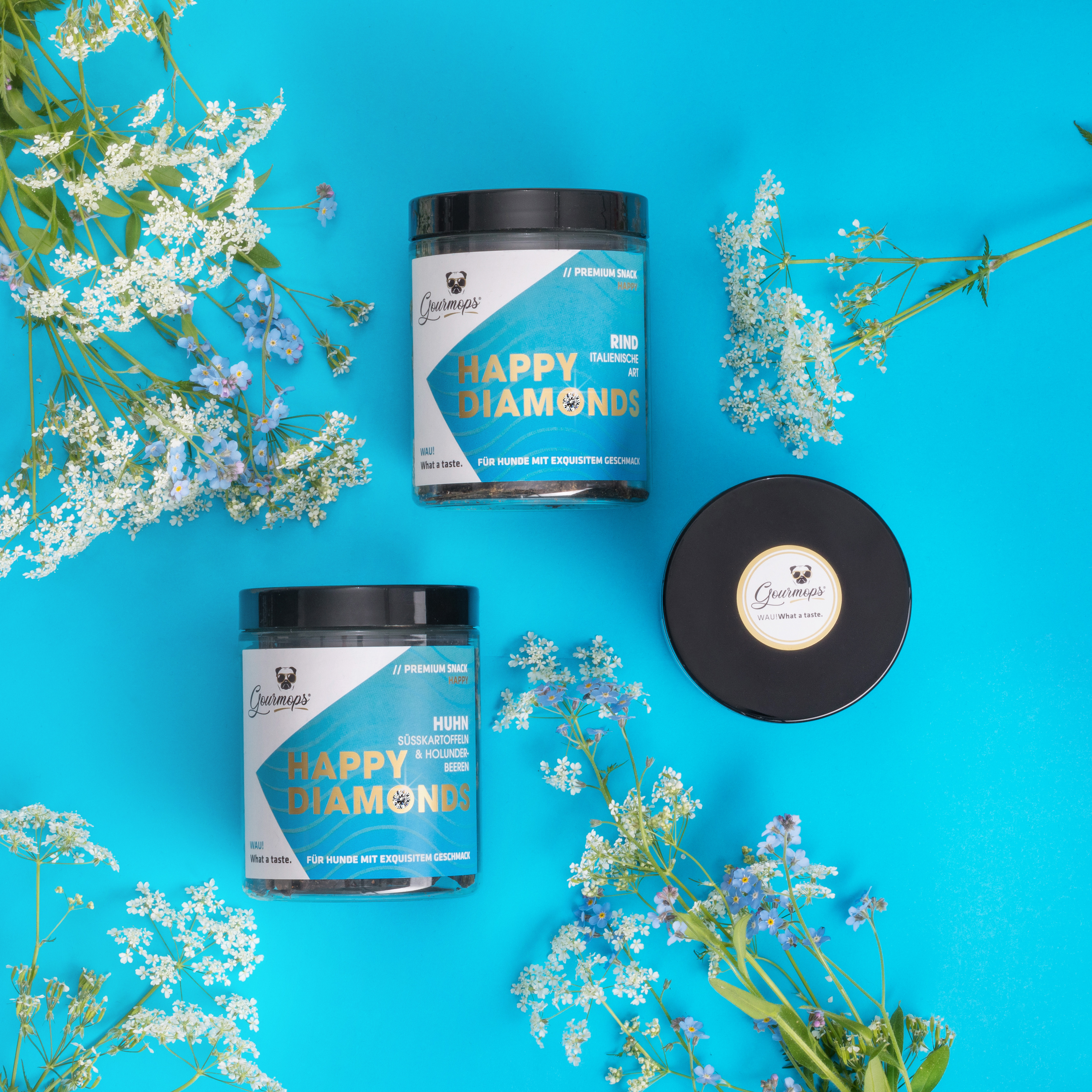 100 % Love and Happiness. Unsere HAPPY DIAMONDS sind Premium-Snacks, die aus feinstem Fleisch sowie einer harmonischen Komposition von Gemüse, Obst und Kräutern bestehen. Diese hochwertigen Zutaten liefern zusätzliche wertvolle Vitamine und fördern das Wohlbefinden deines Hundes. Verwöhne deinen Vierbeiner mit gesunden Snacks, die Freude und Glücksmomente bringen!