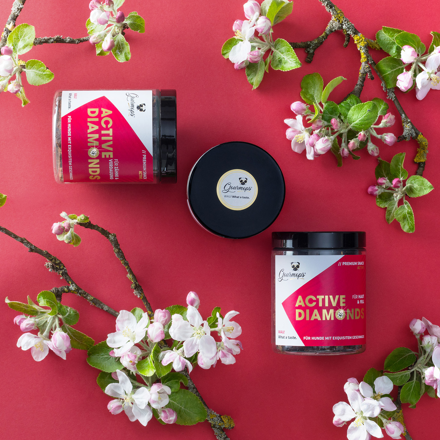 100 % aktiv und vital. Unsere ACTIVE DIAMONDS sind Premium-Snacks, die feinstes Fleisch und frisches Gemüse vereinen. Angereichert mit einem speziellen Wirkkomplex fördern sie gesunde Zähne und eine optimale Verdauung oder unterstützen die Hautgesundheit und ein schönes Fell. Ideal für aktive und glückliche Hunde!