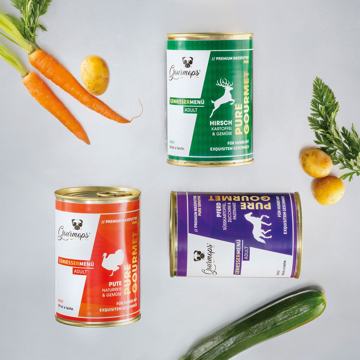 100 % Gourmet-Genuss. Unser PURE GOURMET ist das Premium-Nassfutter für erwachsene Hunde, das reich an frischem Muskelfleisch und ausgewählten Gemüsesorten ist. Hergestellt aus 100 % natürlichen Zutaten und schonend gegart, bietet es eine gesunde und schmackhafte Ernährung für deinen vierbeinigen Freund.